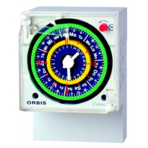 CRONO QRD Электромеханический одноканальный аналоговый таймер, 1 канал (сутки), минимальное время переключения 15 минут, монтаж на DIN-рейку, поверхность, IP20, аккумулятор минимум 100 часов |